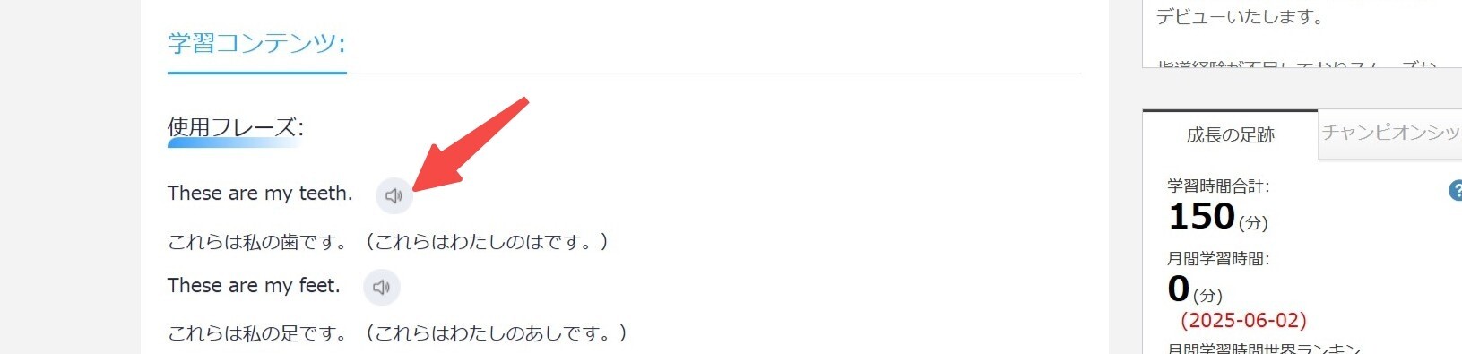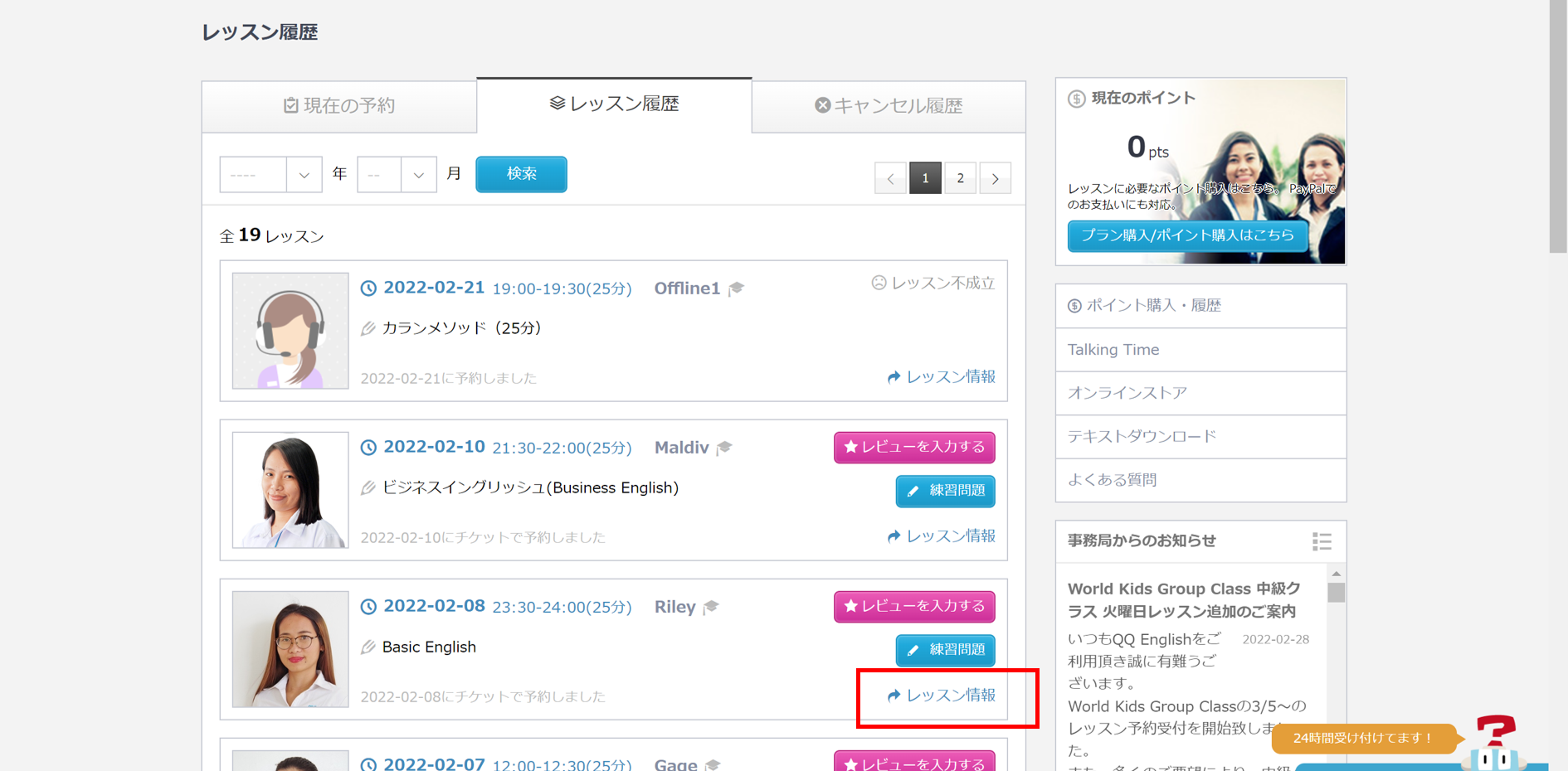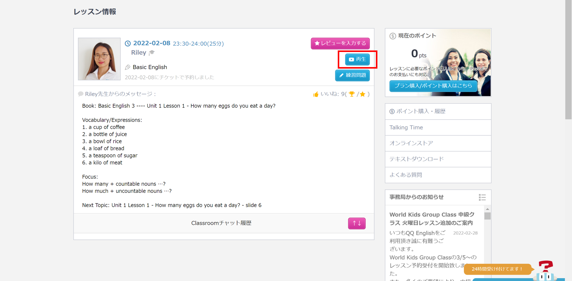 マイレッスンページ→レッスン履歴を開きます。このページでは、すべての教師とのレッスン履歴が時系列に並べられているので、特定の日の特定のレッスンを選ぶことができます。レッスンを選び「再生」ボタンを押すことで、レッスン録画機能を再生が可能です。