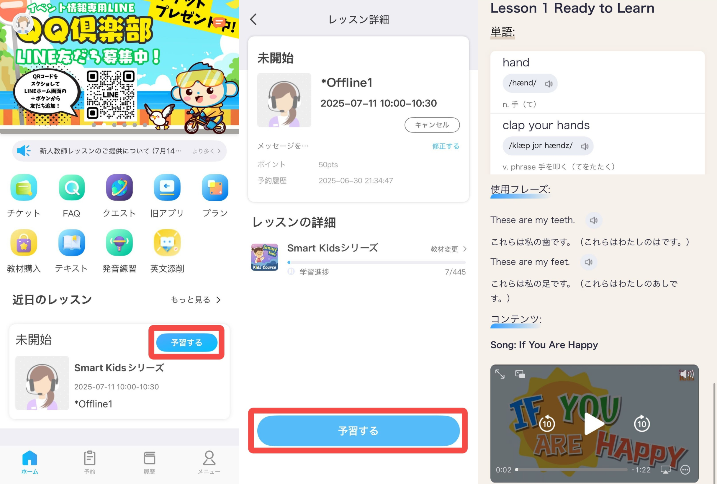 直近の学習内容がSmart Kids4のため、予約時点での予習範囲は「Smart Kids4」、
