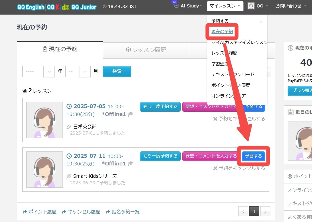 ※カレンダーからも予約されたレッスンをクリックすると「予習する」ボタンが見られます。
