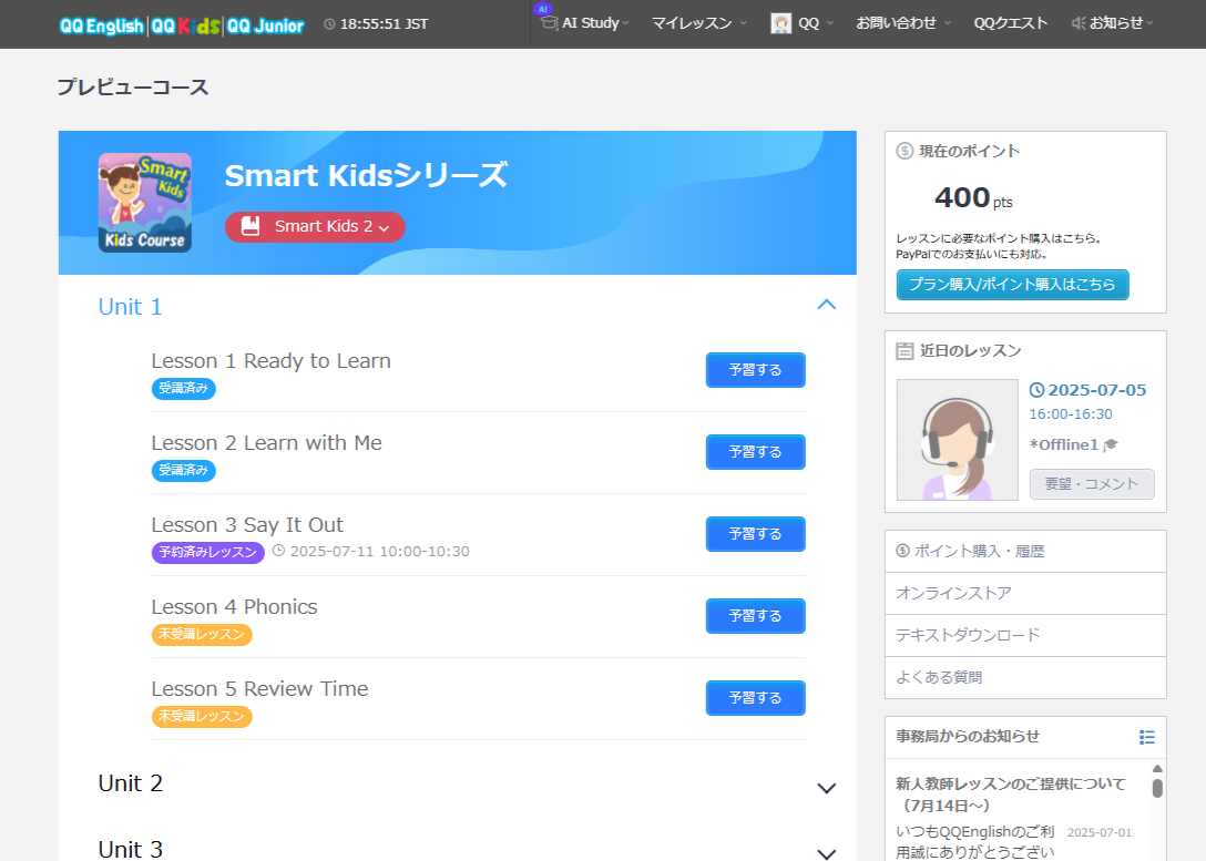 リクエストしたレッスンの受講が完了後、予習範囲が「Smart Kids3」となります。