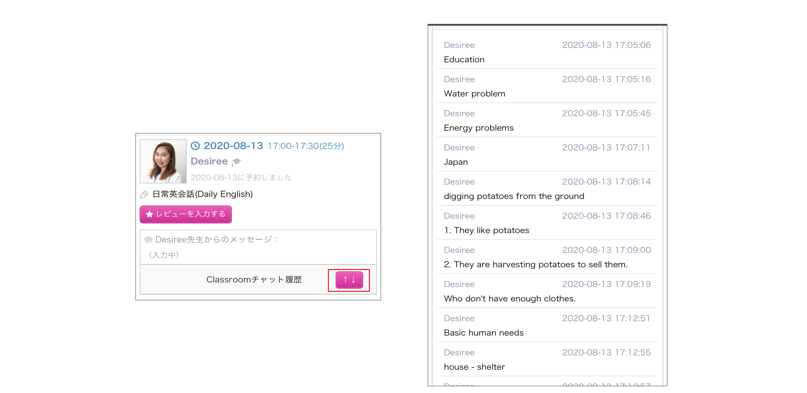 「Classroomチャット履歴」の[↑↓]ボタンを押すことで、レッスン中のチャット履歴を開くことが可能です。
