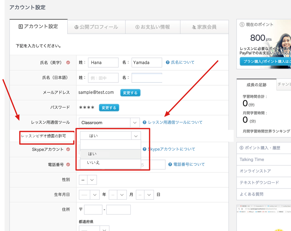 マイレッスンページ→アカウント設定→「レッスンビデオ録画の許可」で「いいえ」にすることで非表示に切り替えが可能です。
